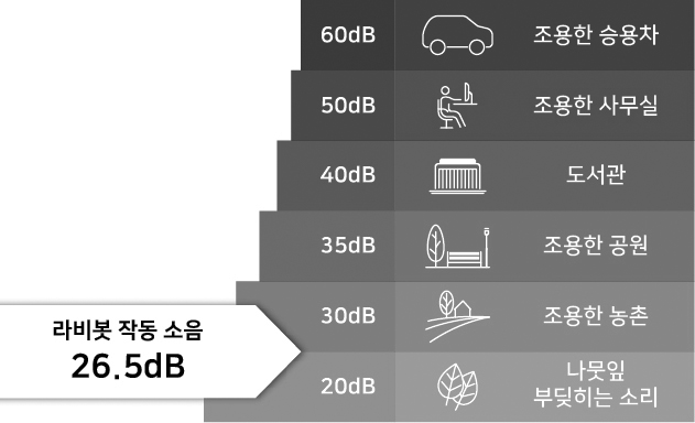 라비봇의 작동음 수치는 26.5 dB(데시벨)로 집 안에 두어도 작동음이 느껴지지 않는 저소음 청소 기술을 적용하였습니다. 청각이 예민한 고양이들에게 라비봇은 편안하고 아늑한 공간이 됩니다.